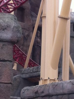 The ride features a waterfall that is approximately fifty feet tall. The final helix of the ride's track travels through a tunnel in the waterfall, and behind the falling water. The barrel roll element of the ride has the riders travel upside down over three pools on top of the waterfall. There is at least one large statue "carved" into the rear of the waterfall. The waterfall is made of concrete sprayed over a steel structure.
