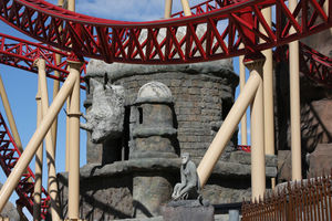 The entrance to the ride's final brake run features a false stone facade built in a style somewhat similar to the temples in the ride. The trains enter under an archway that that that has a snake's head above it, a man holding an axe on the left of it, and a man holding a sword and extending his other hand on the right of it.
