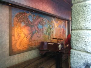 The station houses a large, multi-panel mural depicting a large dragon, a club-wielding caveman, flying ghouls, a mummified skeleton, an octopus, a snake in a tree, a lizard, a monkey and two spiders in front of an ancient-looking ruined city under a starry night sky. The current mural is a copy of the original that was hand painted by Bill Tracy.