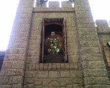 The ride has a castle-like facade with a large skeleton and a witch that pop out from shutters in the castle's two turrets. There are colorful, blood spattered letters spelling out "Terroride" on the front of the ride with the letter O represented by a stylized skull with red, light-up eyes. The other letters rock back and forth and are lit from inside at night. A signature Bill Tracy vulture prop is perched in a nest atop the southern turret. The vulture's head moves up and down in sync with the facade's other animations. Large open archways in the castle facade allow the station and its mural to be seen from outside the ride. A prop dead tree sits on the ride's roof.